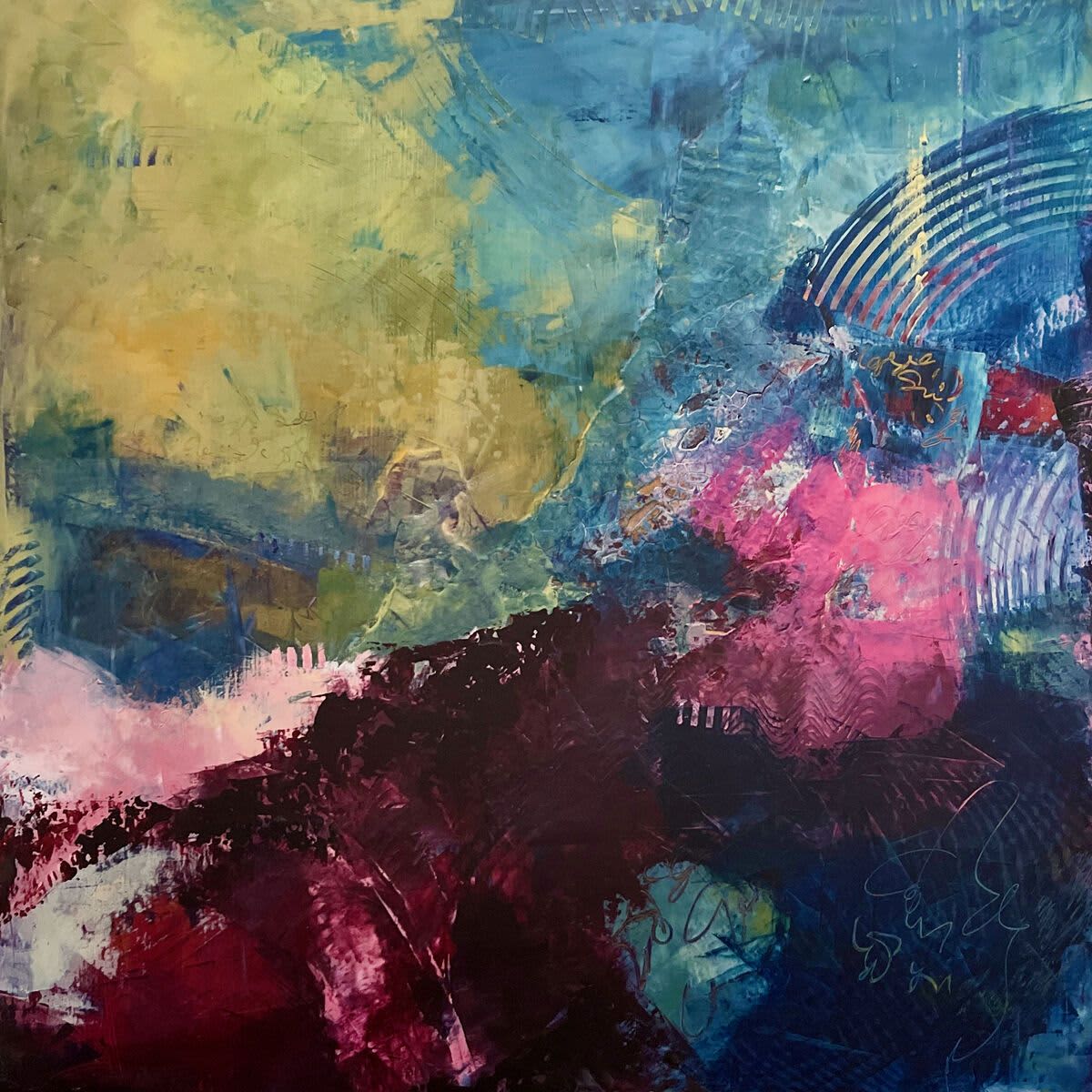 30"x30"x2" cradled panel, oil cold wax, deep red, bright pink, dark blue, yellow green creating a bridge between two undiscovered worlds