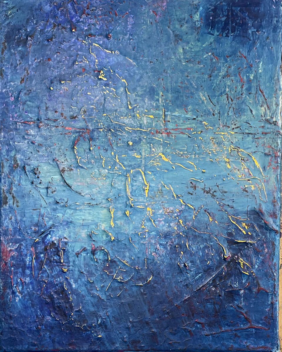 16"x20" canvas-oil cold wax-blue, yellow and red threads