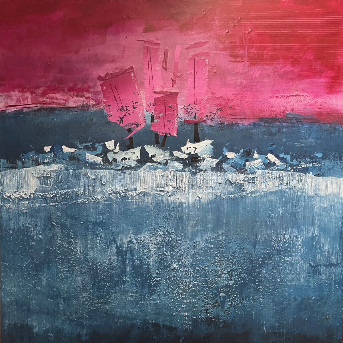 30"x30"x2" cradled panel, oil cold wax, magenta, pink, sea blue
