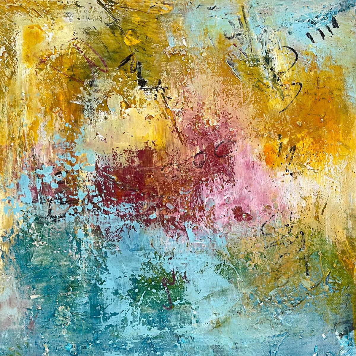 An oil and cold wax abstract painting on canvas. Bright colors of gold, teal and magenta.