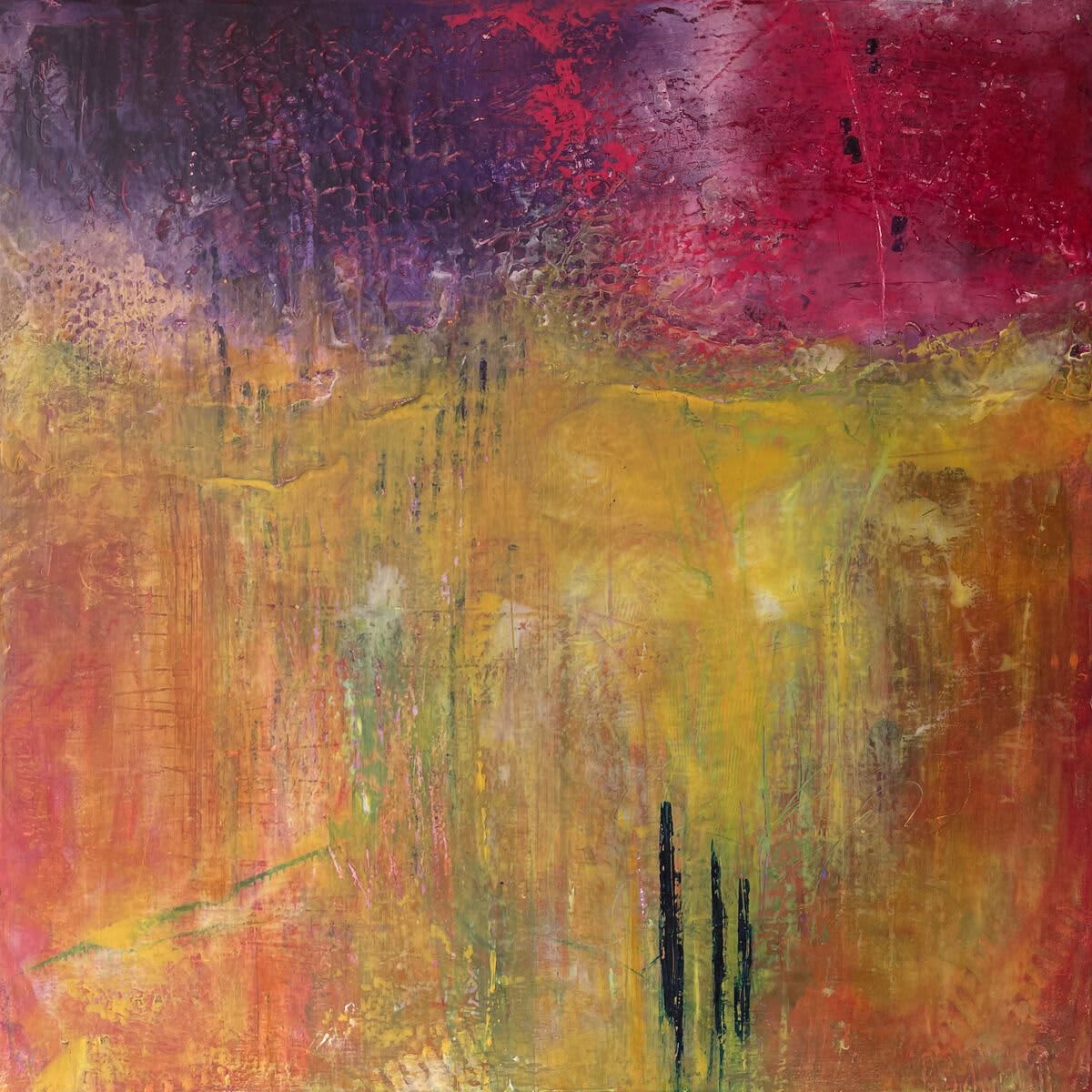 Currently exhibiting at the Crossroads Art Center as part of the Metro Richmond Artist Association's annual juried show. This painting received first place. An oil and cold wax abstract painting on a 24" x 24" cradled panel. Deep purple, rich magenta, vibrant yellow gold colors.
