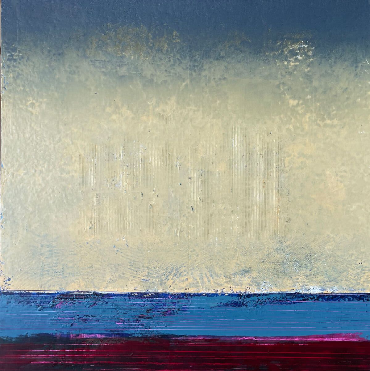An oil and cold wax abstract painting on a 30" x 30" x 2" cradled panel depicting the summer sun shimmering off the ocean and coral shore.